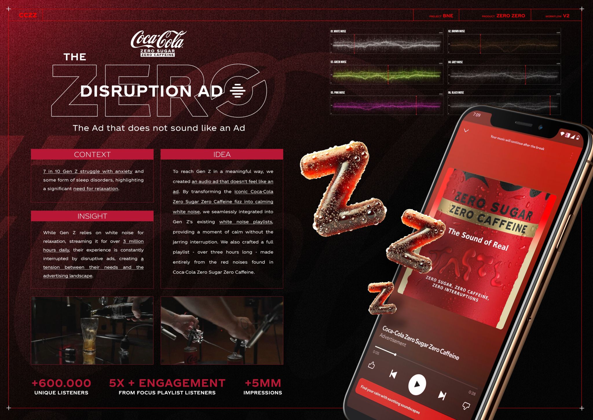 IDEA: We created an audio ad that doesn’t feel like an ad by transforming the iconic Coca-Cola fizz into calming white noise. We seamlessly integrated it into Gen Z’s existing white noise playlists, providing a moment of calm without the jarring interruption. We also crafted a full playlist made entirely from the different colored noises found in the fizz.